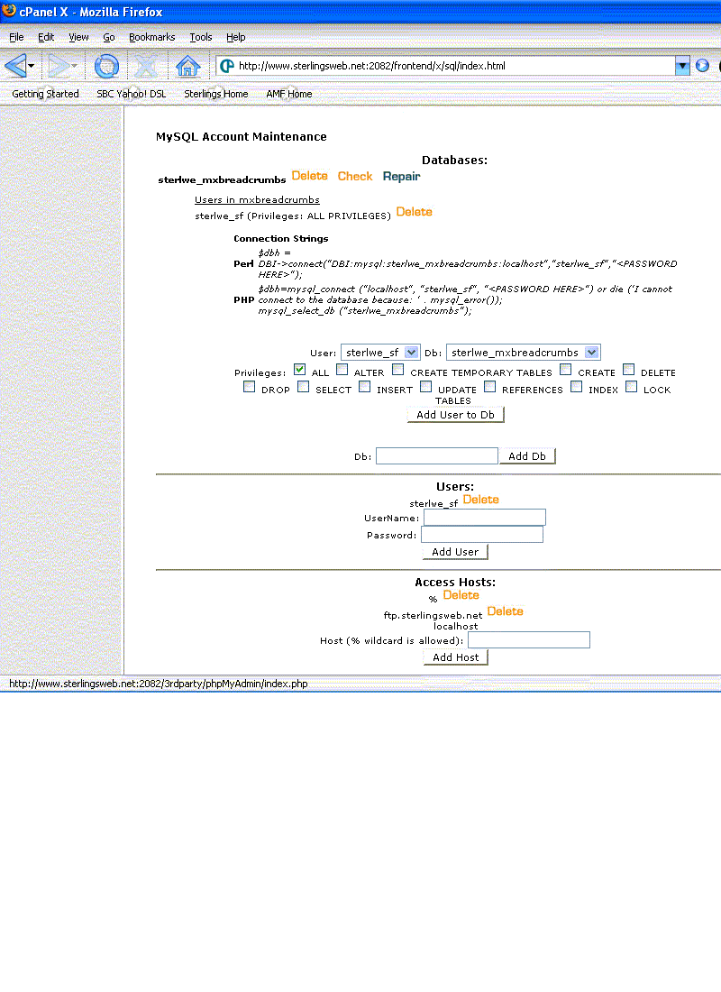 acsteve Posted October 11, 2005 Posted October 11, 2005 WOW i can not remember feeling like i have been whipped.I first posted in dreamweaver of TCH about not being able to connect to mysql. Then i got it. using the % sign in access hosts of the c panel i was able to connect. I have tried to create more databases to use the tut. on breadcrumbs and can not hook up again. not to be confusing but here is where i started with my post. http://www.totalchoicehosting.com/forums/i...showtopic=23172 If you would read my "Got it" reply and you can see i was off on my merry way. I did not want to get my real website mixed up with interakt tut on breadcrumbs so i was going to make a site called breadcrumbs. I defined a site called breadcrumbs. loaded the .sql that comes with the free ext., did all like before and can not hook up. Can i not make any site and database i want and be able to hook up? Ok here is what I did. In the mysql connection box you get in DWMX2004 when connecting to mysql i completed like this: connection name: breadcrumbs mysql server: localhost amf_xx password xxxxxx I then go to slect and then get an "can not find server again, and again. I created a user name, and assigned it to the database. I put the % sign in access hosts (that worked last time) but it does not connect. I also put in under mysql server amfmechanical.com and all kinda of other stuff. I have not put my ip address because it changes when ever i hook up to the internet at the office or at home, so I am not sure what to do there. I just do not understan why it worked one but not anymore. I tell you i have no t ever been so long on something as this. Oh well if you can help i sure would be greatful thanks beaten bad.... Steve Quote