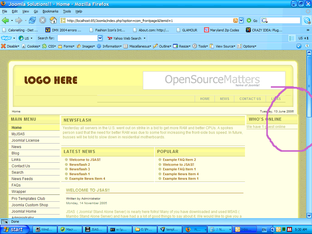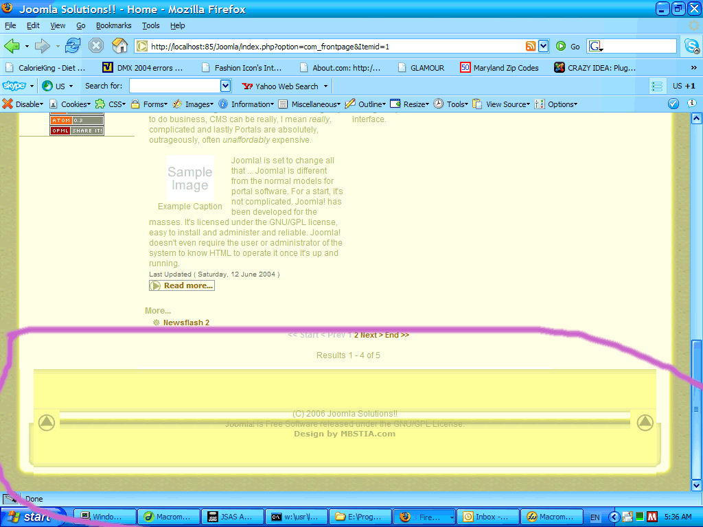 webgyrl Posted June 13, 2006 Posted June 13, 2006 Hi, Is anyone around here familiar with Joomla! and thier templating format? I am brand new to Joomla! and to templating. I have been delving into all the tutorial threads I could find on the Joomla! fourms and on the web and have had a go at modifying an existing template to practice and learn. I have run into a strange error where my layout's sides aren't in the right place (they are off a bit) and my bottom (footer) image seems to be repeating itself in a strange manner. I can't figure out what I have done wrong. I have attached an image of the top and of the bottom of my layout so you can see what is happening. See pink circled areas. I have also attached the zip file of the template files if anyone would be kind enough to have a look at the files and point a newbie in the right direction. I know that tableless design is the new way to go, but I am not quite there yet with my CSS skills and still learning both CSS and PHP. Thank you so kindly for any help you can give. premiersound.zip Quote